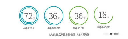 4.分辨率:對于監(jiān)控攝像頭來說,清晰度很關(guān)鍵。攝像機(jī)的分辨率越大、傳感器像素越高,拍出來的圖像就越清晰。但它所占用的帶寬和內(nèi)存空間也會更大,同樣大小的硬盤所能錄下的時間也就越短。以一臺6T的NVR為例: